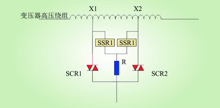 圖7中的X1和X2為有載調壓型配電變壓器的高壓繞組的2個抽頭;SCR1和SCR2為無觸點電力電子開關雙向晶閘管,SSR1和SSR2R為固態繼電器,R是起限流作用的過渡電阻。假定最初有載調壓型配電變壓器運行在繞組分接頭X2位置,雙向晶閘管SCR2則處于全導通狀態,電流通路為X2-SCR2,SSR1、SSR2、SCR1均處于斷開狀態。當需要將分接頭由X2調整到X1時,調整過程具體包括:先觸發導通固態繼電器SSR1,然后關斷SCR2,電流通路變為X1-SSR1-R,再觸發導通SCR1,電流通路變為X1-SCR1,這樣就完成了一次分接的轉換。與傳統機械式有載調壓開關相比,不存在任何的運動部件和電動操作機構,真正消除了原有的故障隱患,完全由軟件控制實現分接的選擇和快速切換。該方案還處于研究與完善階段。