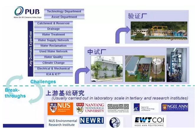 而如何將重大工程和科研投入,實實在在地轉為產業推動力,新加坡的實證研發和示范研發機制功不可沒。水處理技術從實驗室到中試再到生產規模使用,須經歷一個長期過程,而新技術的應用,獲得業主的信任和試用的成本也很高,這也是水處理技術推廣難和推廣慢的問題所在。